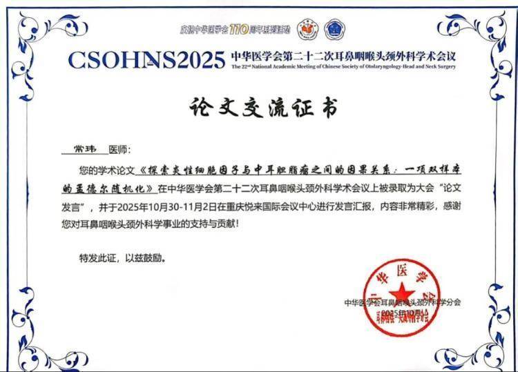 10月30日至11月2日,中华医学会第二十二次耳鼻咽喉头颈外科学术会议在重庆召开。在科室主任常玮的带领下,长治医学院附属和平医院耳鼻咽喉科团队携7项研究成果参会,创科室历届参会成果数量新高。成果涵盖耳外科、头颈肿瘤、咽喉反流、嗓音医学等多个方向,包括2项大会发言、1项壁报展示及4项书面交流,充分展现了科室在临床、科研与教学方面的协同发展。